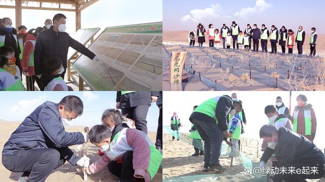 為弘揚民勤防沙治沙精神,鼓勵公眾參與助力當?shù)厣鷳B(tài)持續(xù)改善,2022年12月24日,十余組甘肅當?shù)刂驹刚撸谖渫协h(huán)境保護產業(yè)協(xié)會和“綠動未來”平臺的帶領下,前往騰格里沙漠。大家與治沙英雄石述柱之子石光明一起,探視并養(yǎng)護了“綠動未來”民勤1號林,近距離觀摩學習了“民勤模式”科學治沙技術,并將所學轉化為切實的植樹成果,攜手在騰格里沙漠再植10,000余棵梭梭樹苗,落成又一片“綠動未來”愛心林。