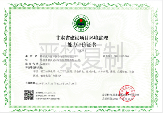 持有的資質(zhì)證書---我公司取得《甘肅省清潔生產(chǎn)審核咨詢機(jī)構(gòu)服務(wù)能力評(píng)價(jià)證書》甲級(jí),(證書編號(hào):GHQJSC-2019-006號(hào))、《甘肅省建設(shè)項(xiàng)目環(huán)境監(jiān)理能力評(píng)價(jià)證書》甲級(jí)(GHJ-2019-004號(hào))、《甘肅省環(huán)境污染治理工程服務(wù)能力評(píng)價(jià)證書》甲級(jí)(證書編號(hào)GHGC-2020-021)。